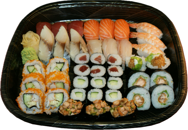 4 st. zalm nigiri, 4 st. tonijn nigiri, 4 st. gekookte garnaal nigiri, 4 st. dorade royal nigiri, 4 st. zalm teriyaki gunkan, 6 st. komkommer maki, 6 st. tonijn maki, 8 st. california maki, 8 st. gefrituurde garnaal maki, 8 st. zalm sashimi, 8 st. tonijn sashimi