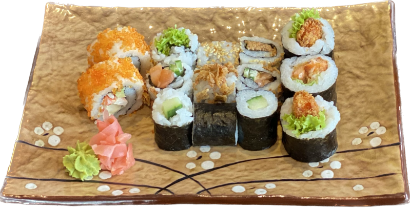 6 st. zalm maki, 6 st. komkommer maki, 6 st. tonijn maki, 6 st avocado maki, 6 st. zoete omelet maki, 4 st. california maki, 4 st. gefrituurde garnaal maki